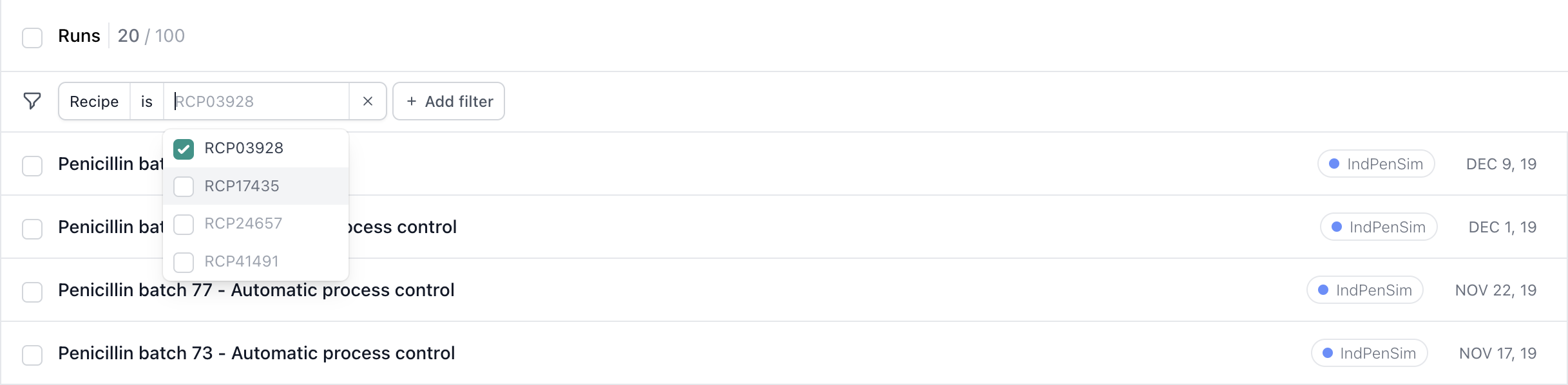 You can filter by any property by clicking Add filter and choosing the run property you would like to filter by. You can include on or more values on each filter.