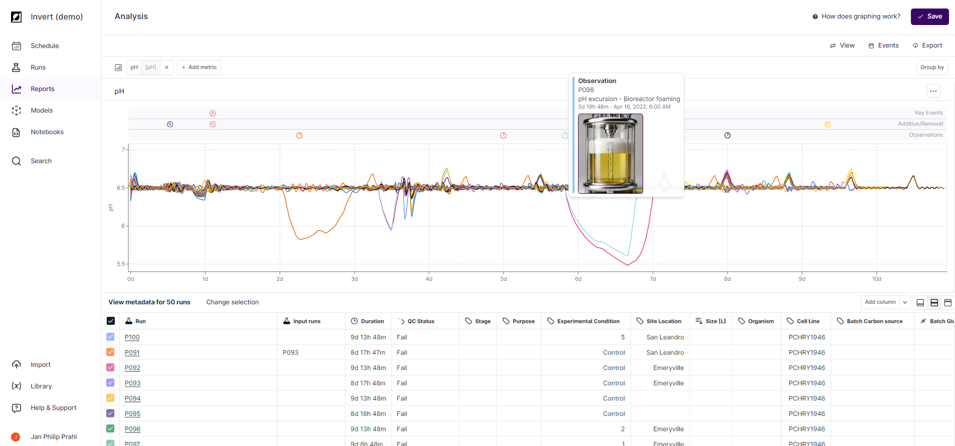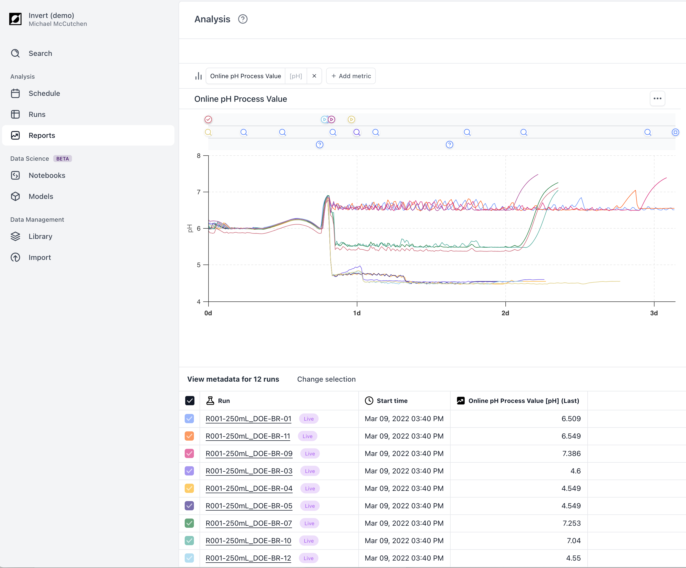 • Use the 'Group by' option to categorize runs by metadata and access Invert's inter-run statistical comparison tools.