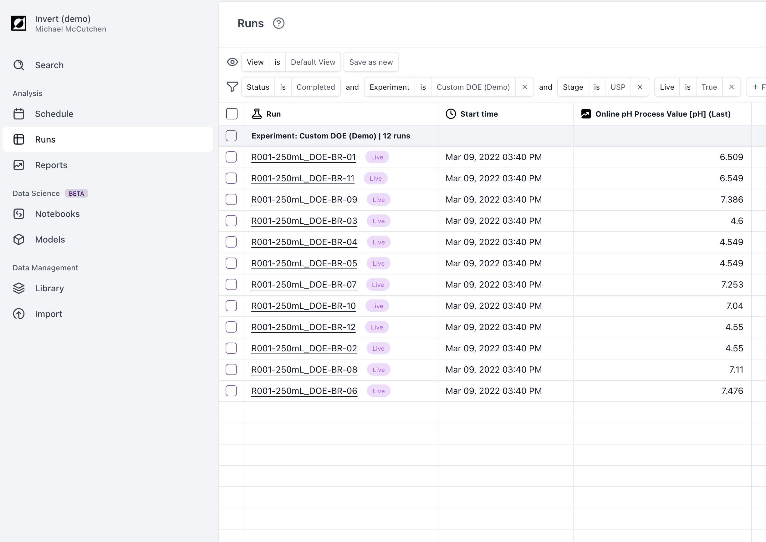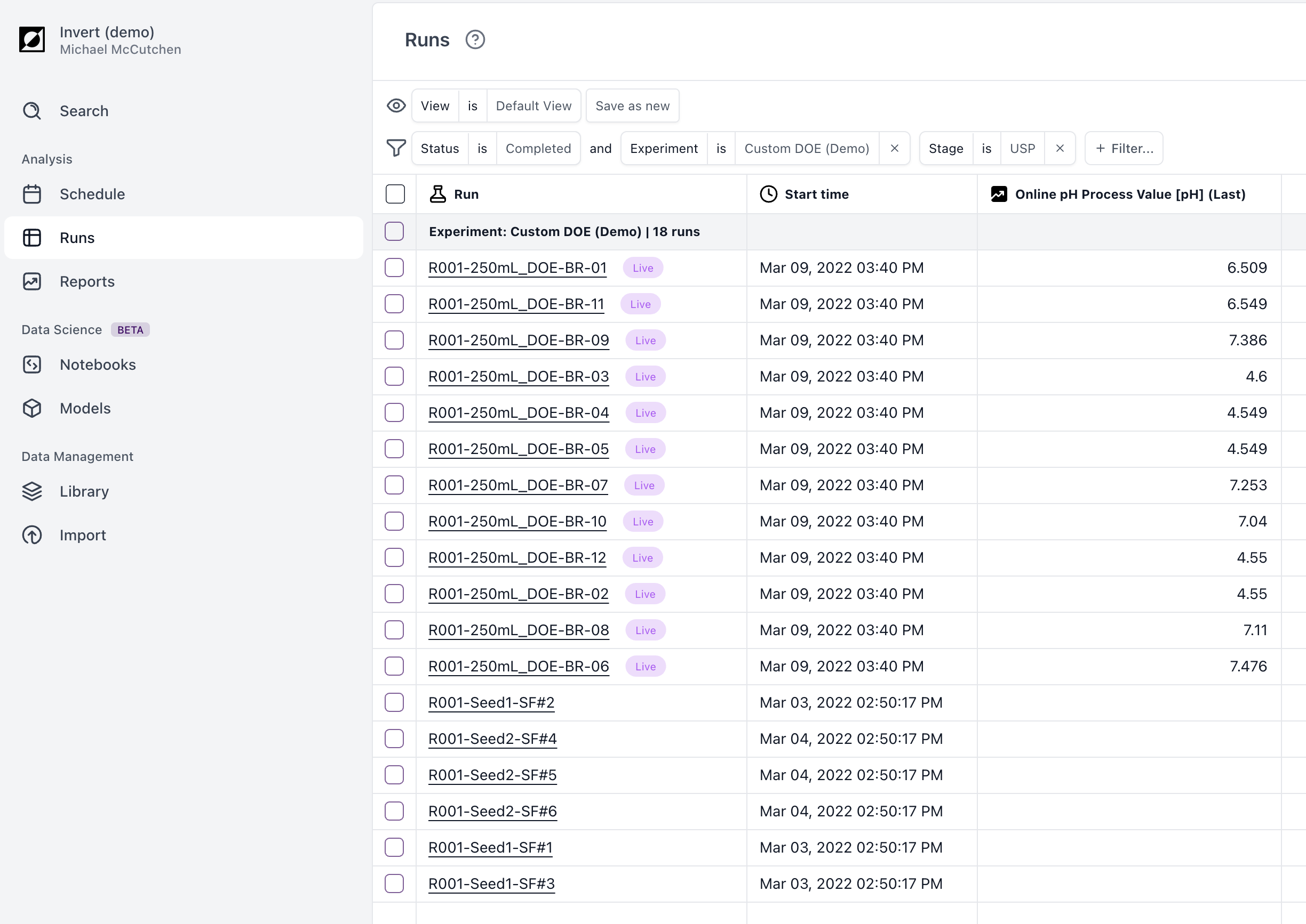 When runs are receiving data right now, Invert will label them with the "Live" indicator. This means that Invert has received data from the last five minutes.
