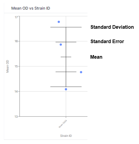 Scatter chart automatically calculates statistics when using X variables with multiple entries providing insights into the distribution of the dependent variable across different categories of the independent variable. The available statistics are mean, standard deviation, standard error, count, and lower/upper 95%. For example, plot 'Biomass concentration (Last)' versus 'Strain ID' where Strain ID has three unique values (Strain ID#1, Strain ID#2, StrainID#3), to get a deeper understanding of how the Biomass concentration varies across each of the unique strain IDs.