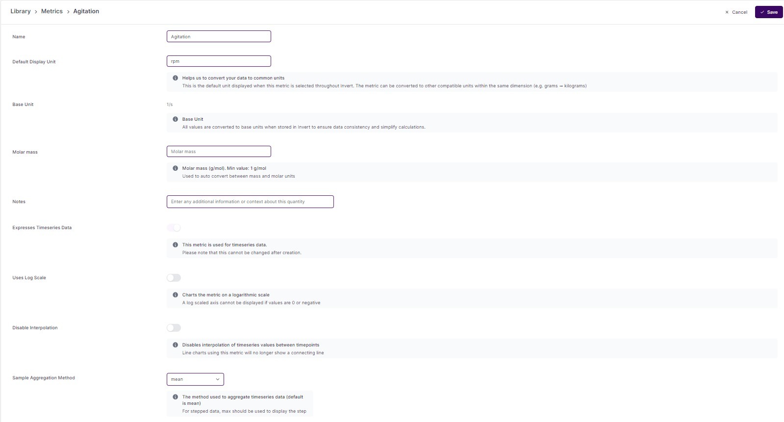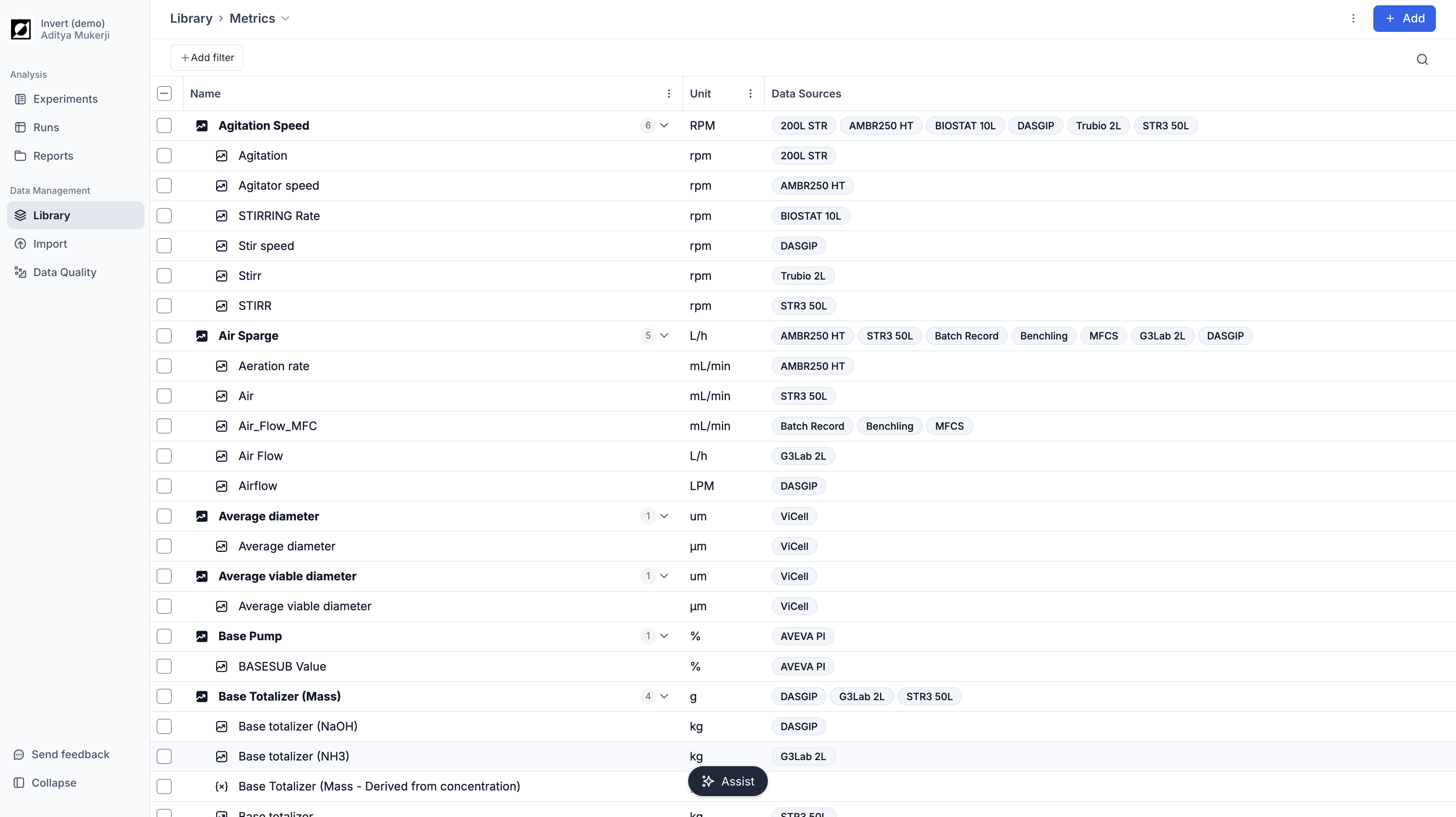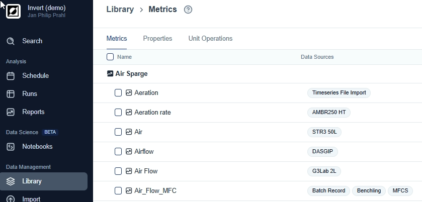 Create derived, custom metrics using the built-in formula editor. Type the custom metric name into the metric dropdown field and click 'Add'. Enter formulas name, dependencies and formulas into the formula editor. Use the formula preview feature for troubleshooting as needed. For more information on formulas, see Library article. In the example below, air flow rate (L/h) and reactor volume (L) are used to calculate VVM, a scale-independent air flow metric to enable comparison of the aeration regime across different bioreactor sizes (0.25L to 100.000L).
