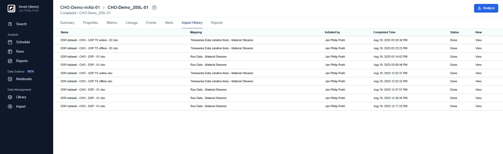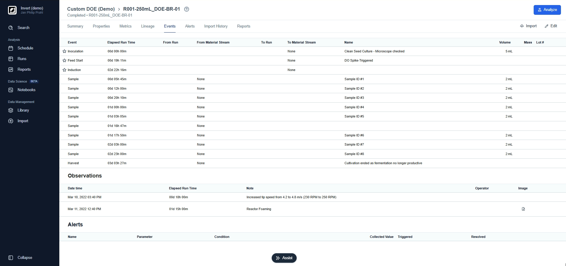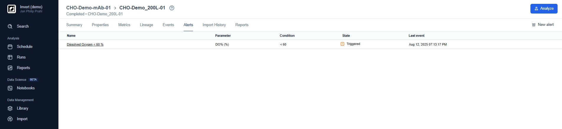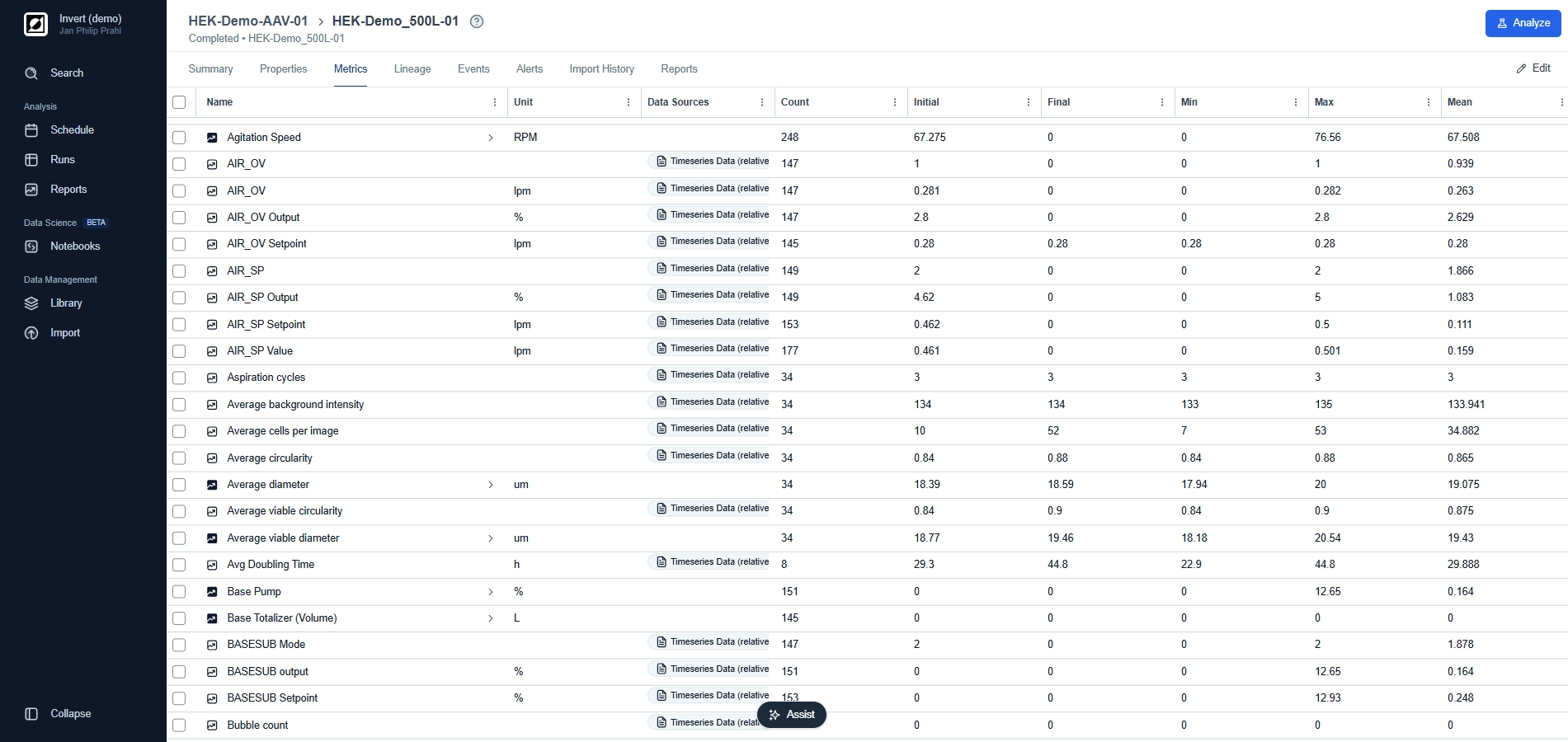 The Analysis page is your go-to destination for visualizing and analyzing your bioprocess data. Here, you can choose between line charts and scatter charts, providing you with the options you need to tell the story behind your data. Use line charts for timeseries data, customize the view and add process annotations using the event feature. For a more quantitative analysis use scatter charts to take advantage of aggregations and non-time based analysis.
