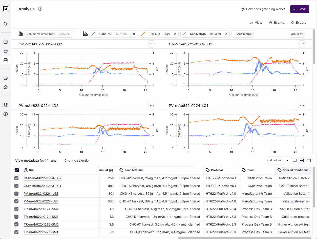 Whether you’re scaling up, or simply comparing data across sites, you can quickly compare your process performance to optimize your next experiment.